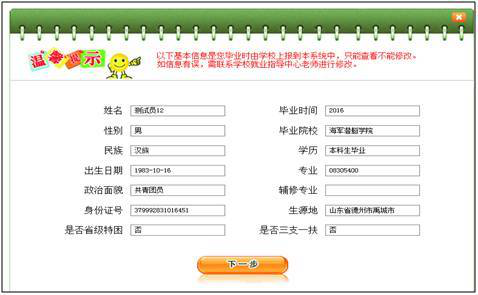 在进行登记之前,系统会弹出基本信息核对页面,基本信息只能查看,不能修改, 如有问题,需及时联系学校进行修改。