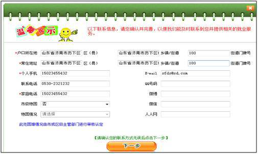 根据页面提示完善家庭住址、电话、邮箱等联系方式,以便于人社部门能及时联系并提供相关服务。