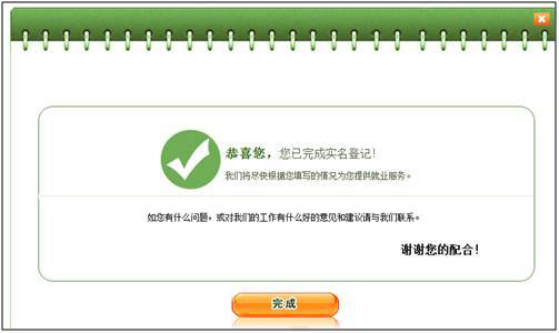 以上信息登记完毕,系统弹出完成页面,实名登记完成。
