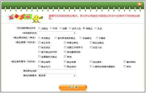 填写当前的就业状态、服务需求、就业意向等信息。