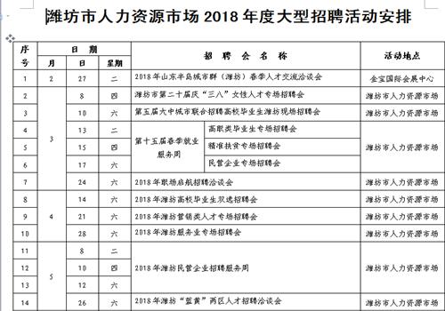 12月19日,记者从潍坊市人力资源服务中心了解到,为充分发挥人力资源市场在资源配置方面的主渠道作用,进一步强化“就业是最大的民生”的指导思想,实现更高质量和更充分就业,为潍坊市“四个城市”建设集聚人才,潍坊市将于2018年2月27日(农历正月十二)在潍坊金宝国际会展中心举办“2018年山东半岛城市群(潍坊)春季人才交流洽谈会”。