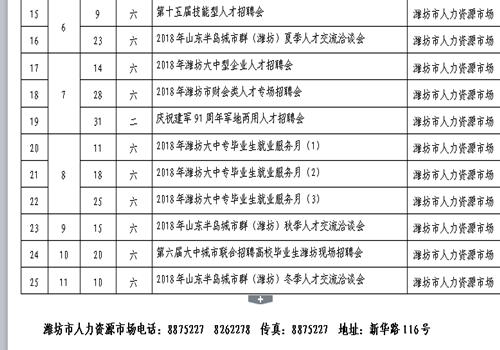 据了解,历年来山东半岛城市群(潍坊)春季人才交流洽谈会参会企业近700家,提供岗位4万余个,入场求职人才5万人左右,具有参会企业多、名优企业多、涉及岗位全、覆盖地区广、入场求职人数多等特点,有招聘用工需求的单位可以联系潍坊市人力资源服务中心进行报名,联系电话:0536-8875227 8262278 。同时,潍坊市人力资源服务中心还公布了2018年大型招聘会安排,全年共有25场大型招聘会,招聘会一直持续到2018年11月份。
